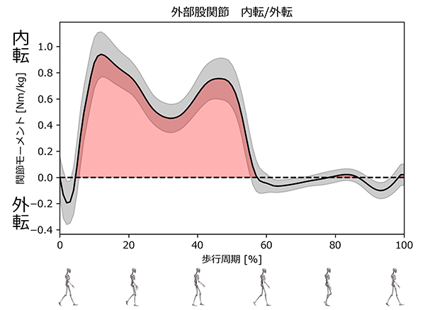 赤塗の領域は股関節内転モーメントの積分値(HAM impulse)で、歩行の立脚期で股関節にかかる総負荷を示す。 - ピーク(最大値)は荷重応答期と立脚終期の二峰性であり、股関節に最も負担がかかるタイミングである。