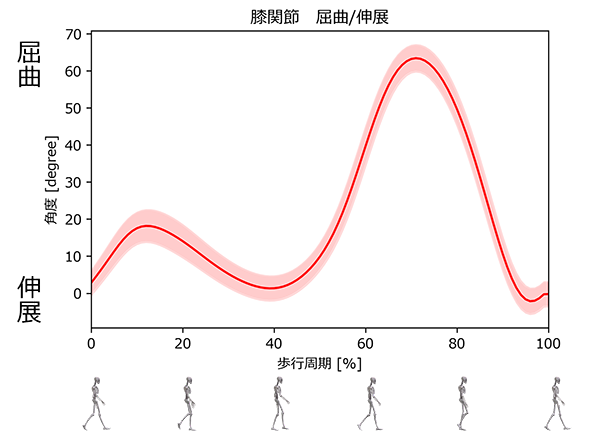 - 患側の遊脚期において、膝関節の最大屈曲角度は健常者や健側と比べて減少する。また、健側は遊脚終期の最大伸展角度が健常者や患側と比べて少ない(より屈曲している)。