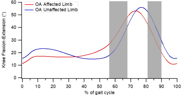 - 股関節OA患者の患側の荷重応答期における膝関節屈曲は、健側と比較して減少している。